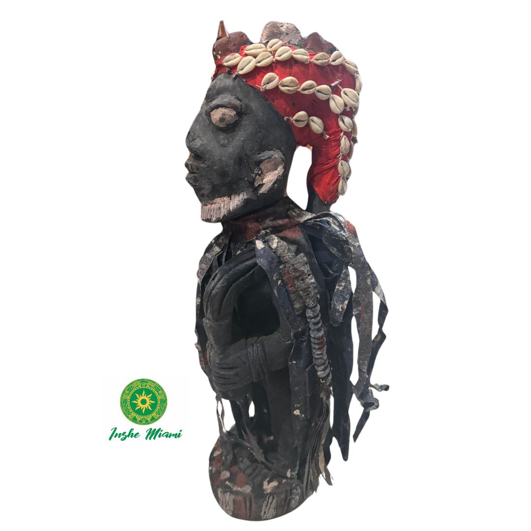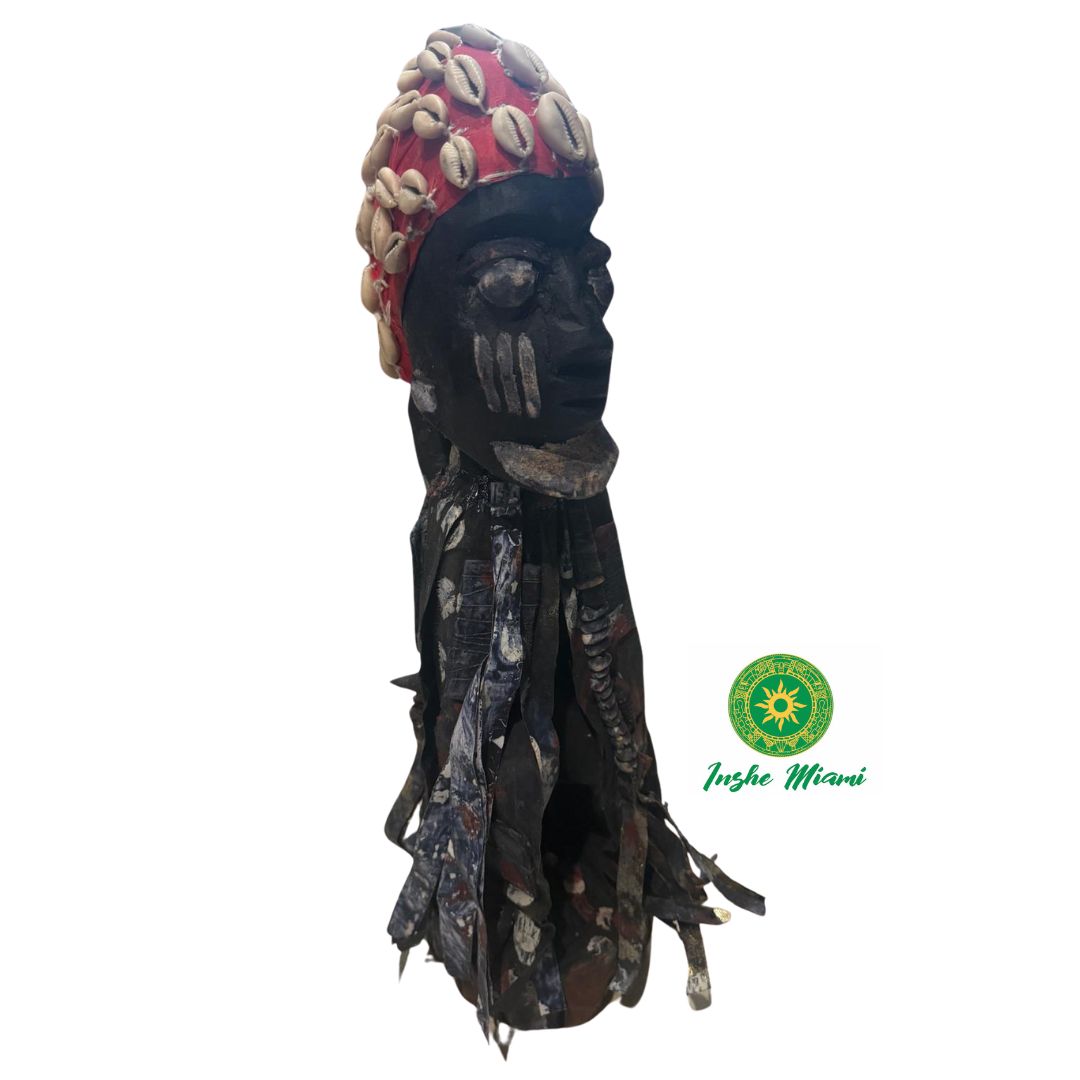 Es una talla de madera que mide aproximadamente 28 pulgadas, decorada con pinturas alegóricas, tiras de tela y cristales que representan la imagen de Esu es una pieza visualmente impactante y llena de simbolismo.
