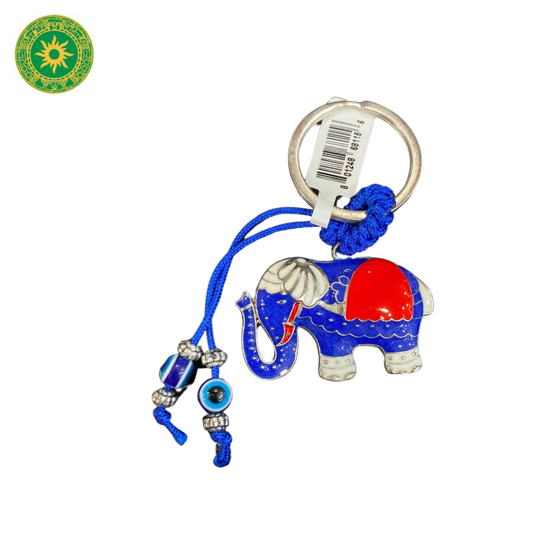 Verskeie sleutelhangers in blou met verskillende ornamente.