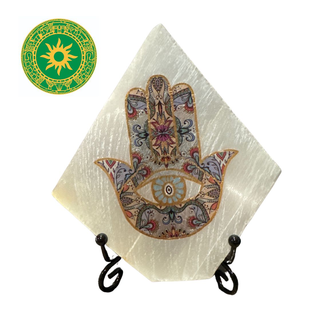 Mano Poderosa en Piedra. Mide 5". Piedra o loza de cuarzo,decorada con una mano de Fatima. Trae su apoyo.
