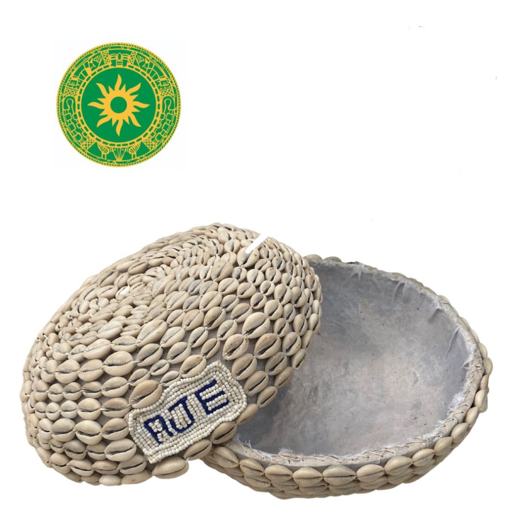Igba Aje Forrada. Calabaza de procedencia Nigeriana, vegetal, o sea es una jicara de guira forrada en cuentas y caracoles, usada para Orisa Aje. Producto importado 100% original de artesanos practicantes de Isese.