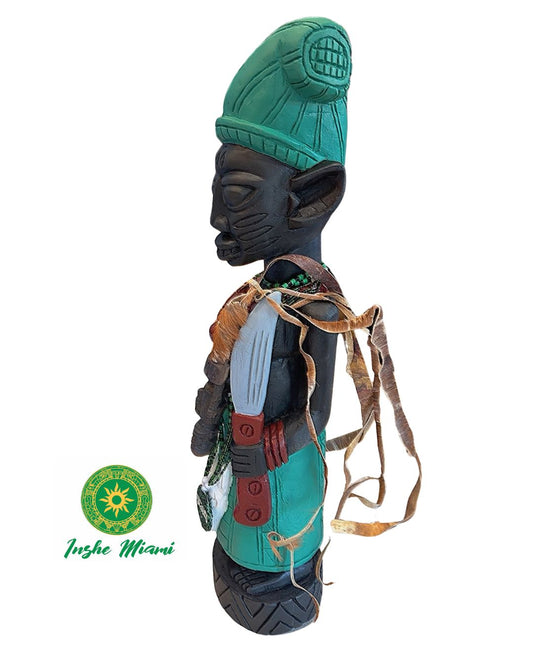 Icono de Ogun 34” en Madera Tallada a Mano – Figura Tradicional Africana con Apiru e Irukere Ritual – Artesanía Yoruba Auténtica