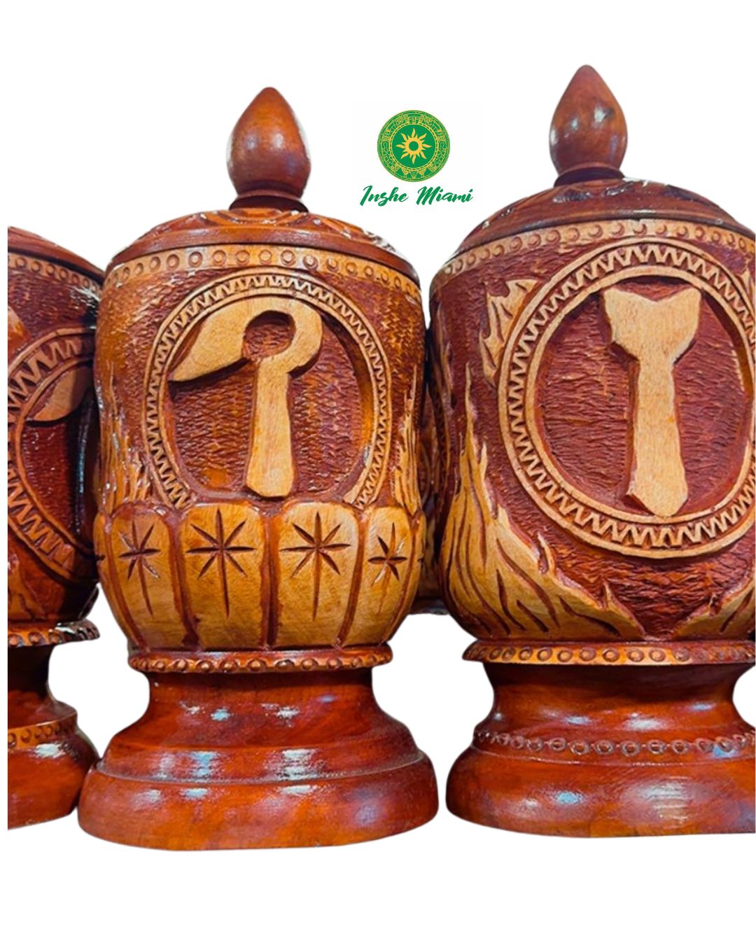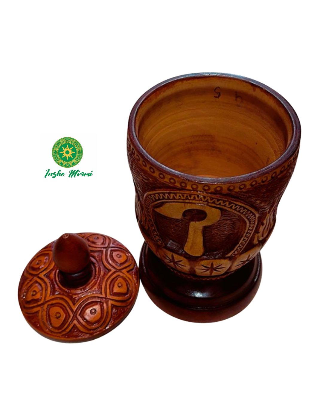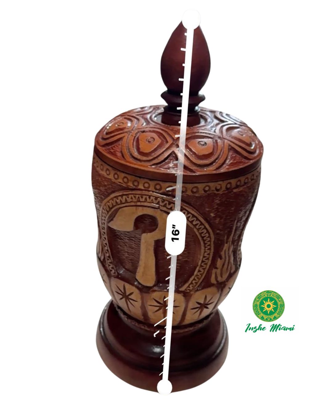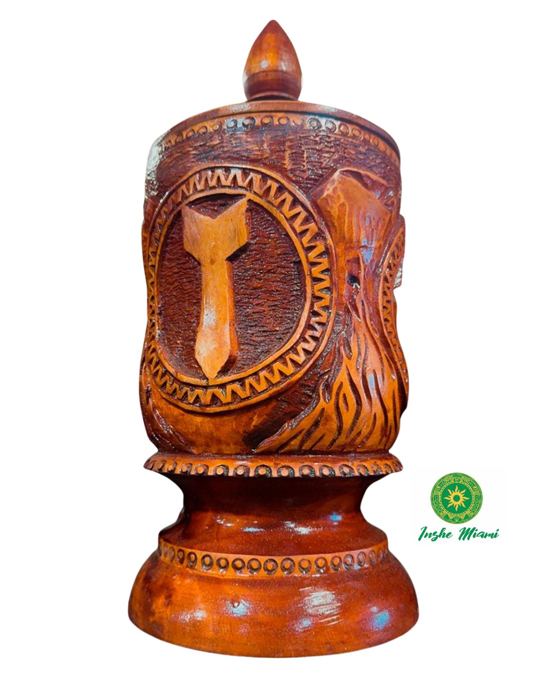 Este lebrillo para Agayú está tallado completamente en madera, con un acabado en tonos cálidos que resaltan la fuerza y la energía del orisha. La pieza mide 16 pulgadas de alto y 7 pulgadas de diámetro en la boca, una proporción imponente que lo convierte en un recipiente ceremonial sólido y dominante, tal como corresponde al Señor del Volcán y de los caminos arduos. Perfecto para un canastillero.