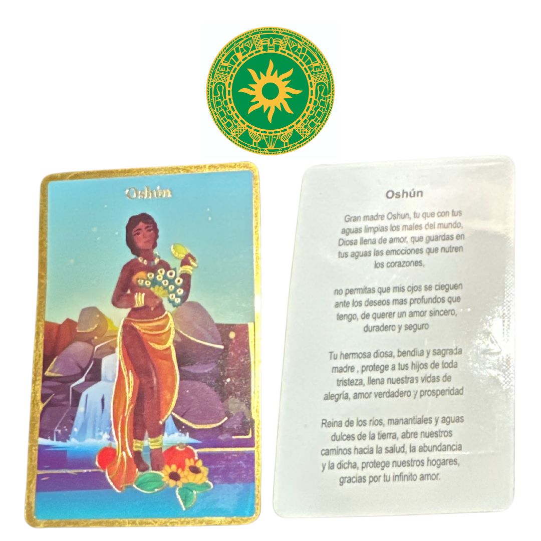 Oraciones e Imagen Yoruba. Por una caratula tiene la imagen decorada en dorado y en la otra la oracion.