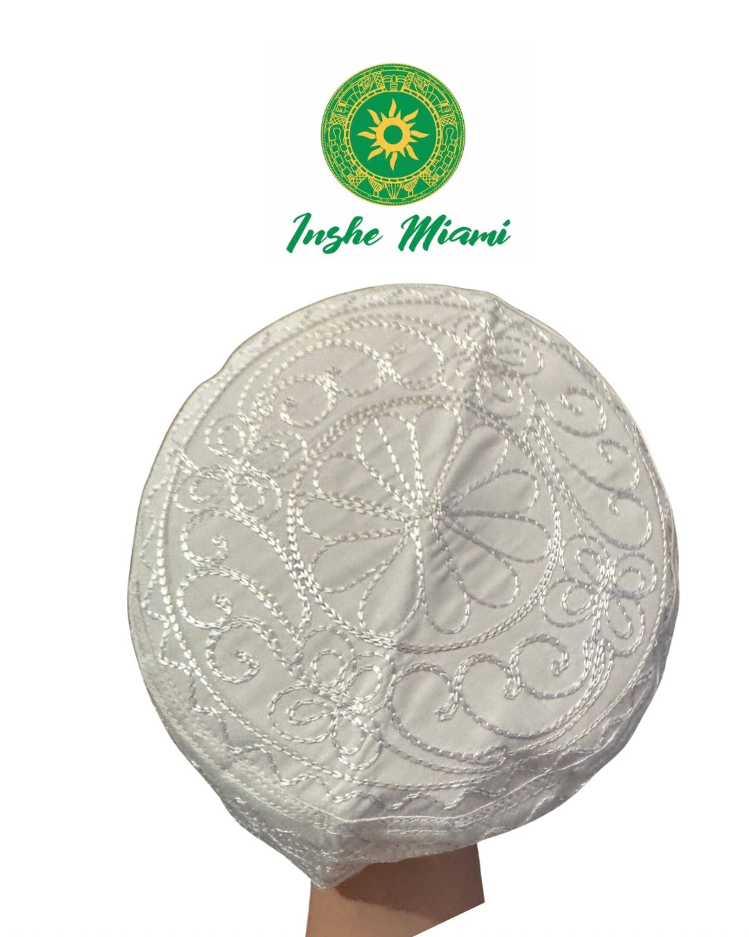 Hermoso gorro tradicional en color blanco, elaborado con tela satinada de alta calidad y delicados bordados en hilo brillante que realzan su diseño clásico y ceremonial. Su acabado detallado presenta patrones florales y arabescos que simbolizan pureza, elevación espiritual y respeto a la tradición.