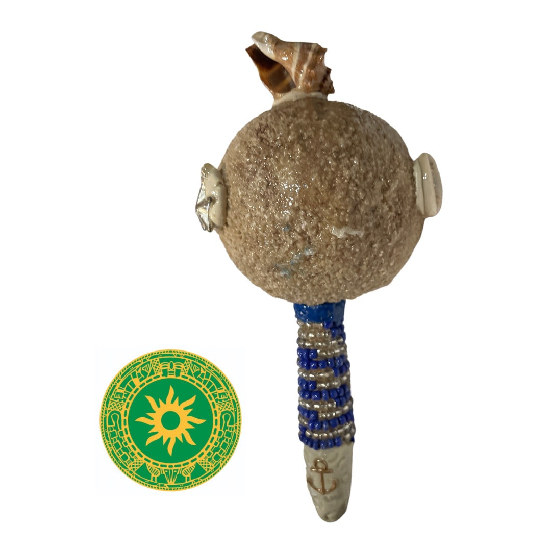 Maraca decorada para YEMAYA. Especialmente decorada con arena de mar y caracol. Mide aproximadamente 7.5" de largo.
