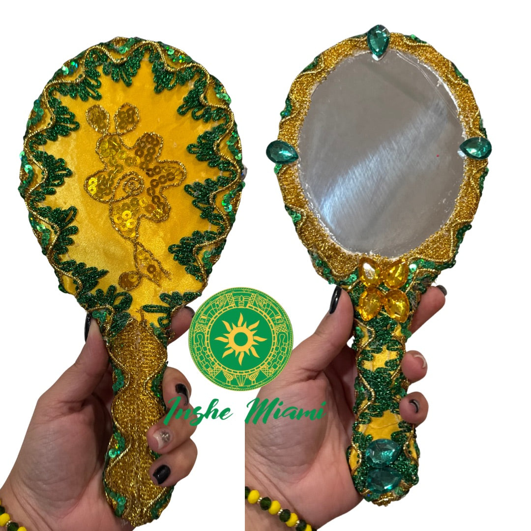 Hermoso espejo decorado de amarillo y verde para Ochun Olorlordi . Mide 10" de largo por 5" de ancho. Cada uno se hace diferente al anterior, el suyo no será igual a ninguna foto, siempre diferente son hechos a mano por nuestro equipo de Inshe. Si desea estar seguro de tener un modelo a su gusto, llámanos contáctanos al 7869553724 y con gusto le asistimos. Las fotos están tomadas por el frente y por denlante. Bendiciones