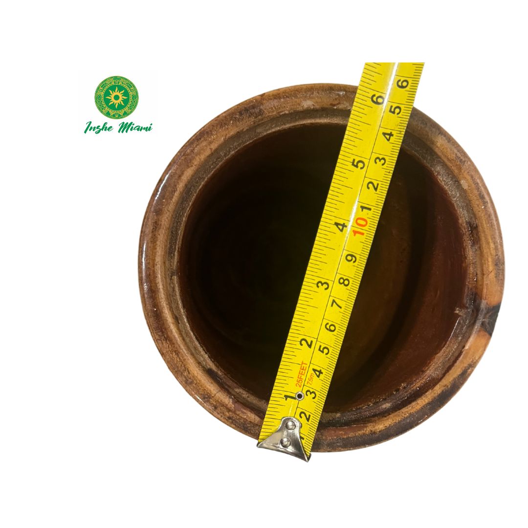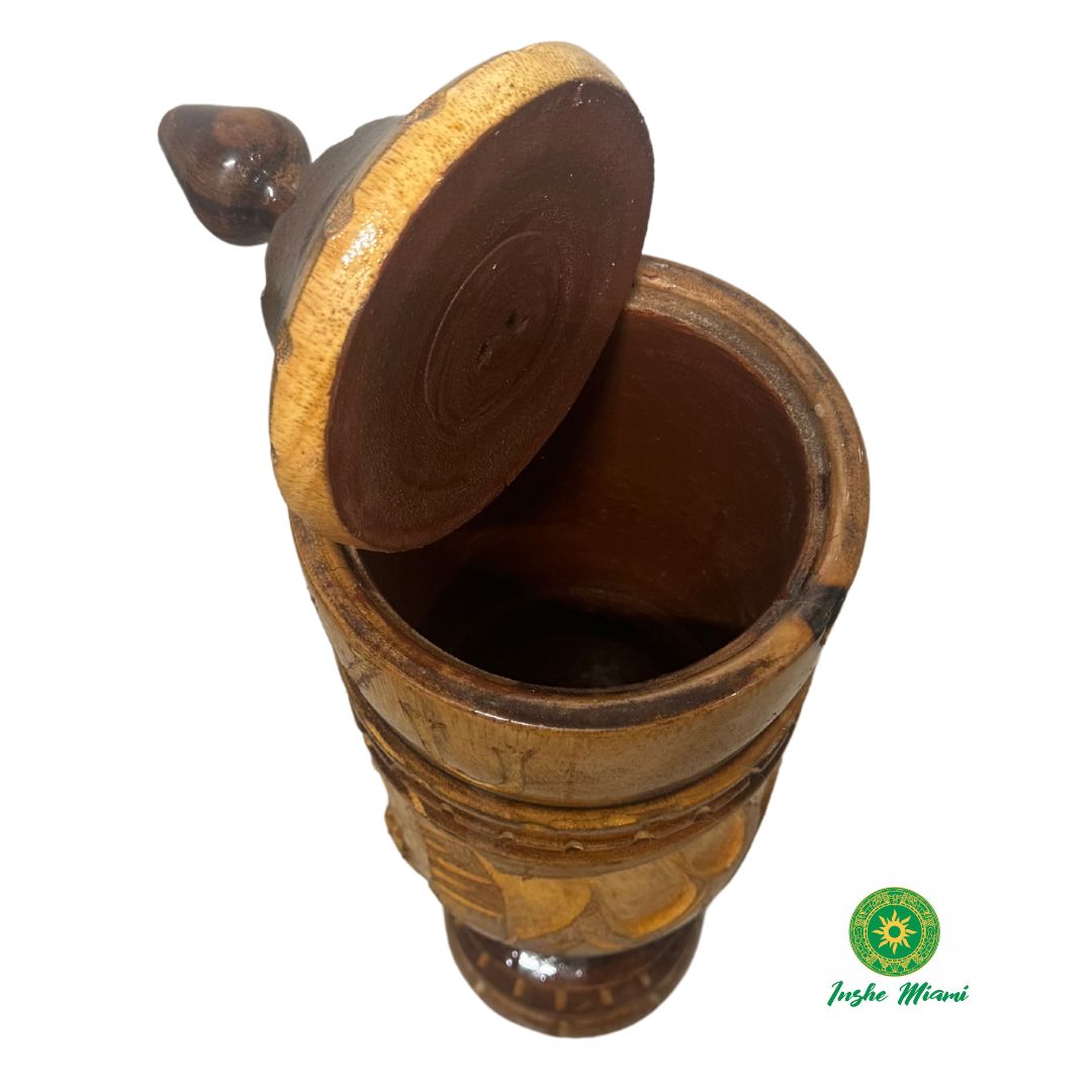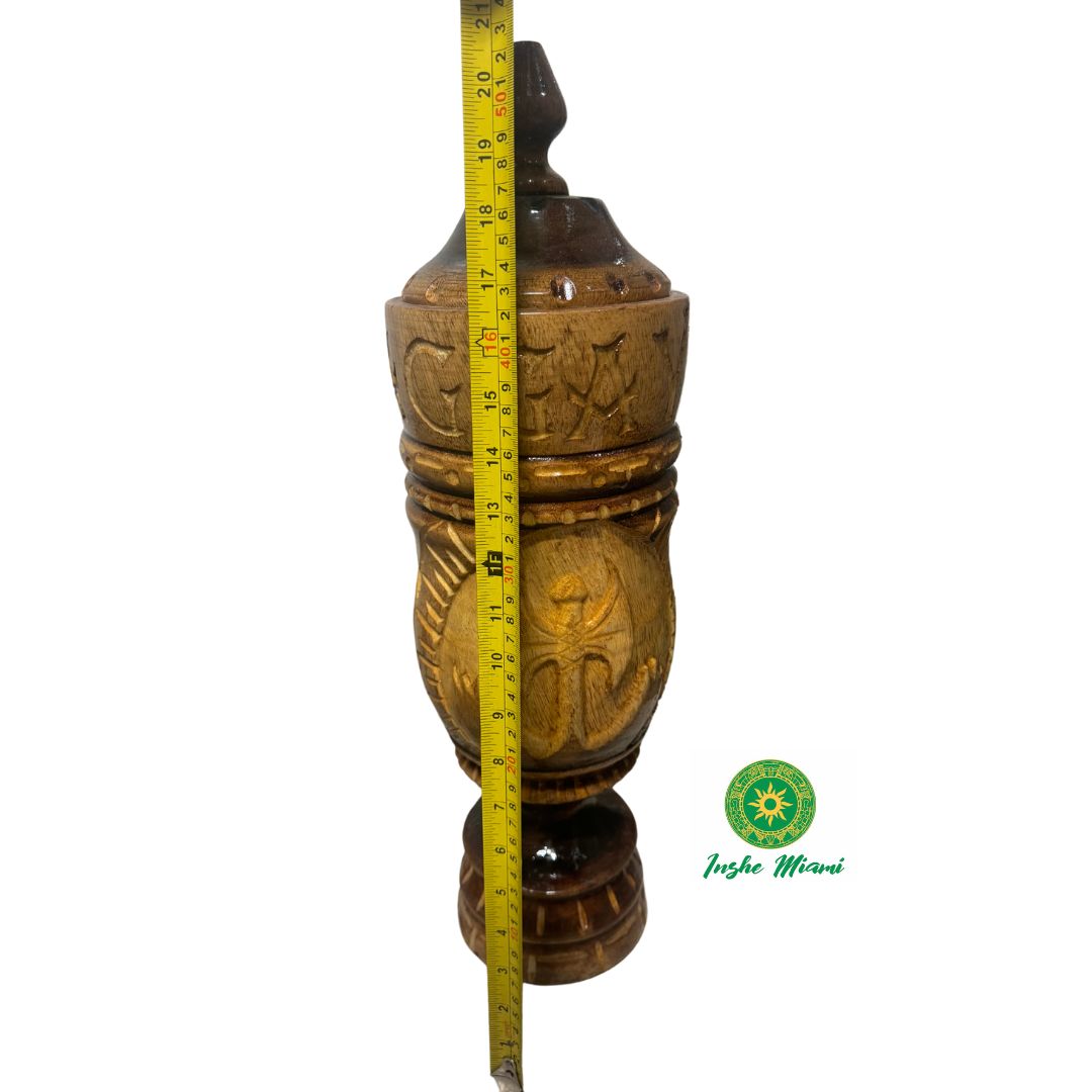 En cuanto a sus medidas, la vasija del lebrillo tiene un ancho de aproximadamente 6 pulgadas y una altura de 8 pulgadas. Considerando la altura total incluyendo cualquier base o soporte, la pieza completa mide alrededor de 21 pulgadas de alto. Este tamaño y diseño detallado no solo lo hacen funcional, sino también una obra de arte significativa dentro de su contexto cultural y espiritual.