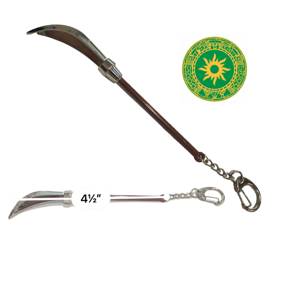 Guadaña en forma de colgante o llavero metálico, muy usado para trabajos y obras de aproximadamente 5" de largo.