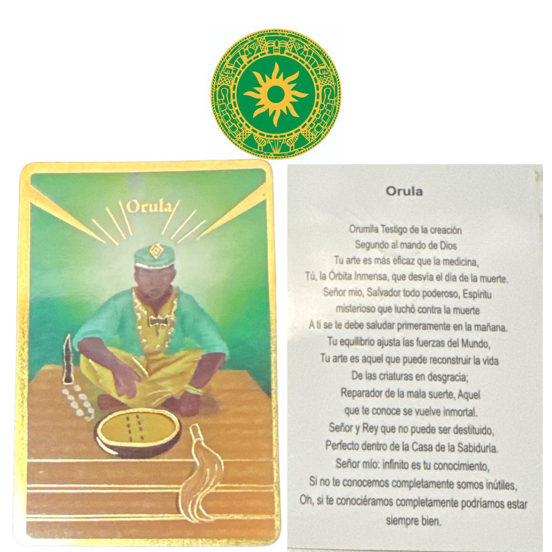 Oraciones e Imagen Yoruba. Por una caratula tiene la imagen decorada en dorado y en la otra la oracion.