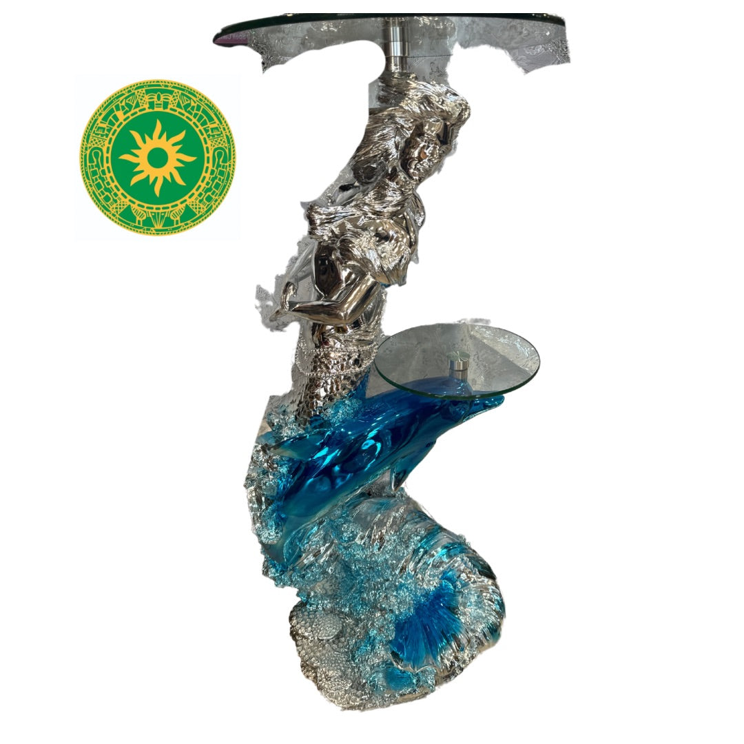 Hermoso Pedestal Plateado. Tiene una figura de sirena con cristal muy resistente. Mide de altura aproximadamente 40".