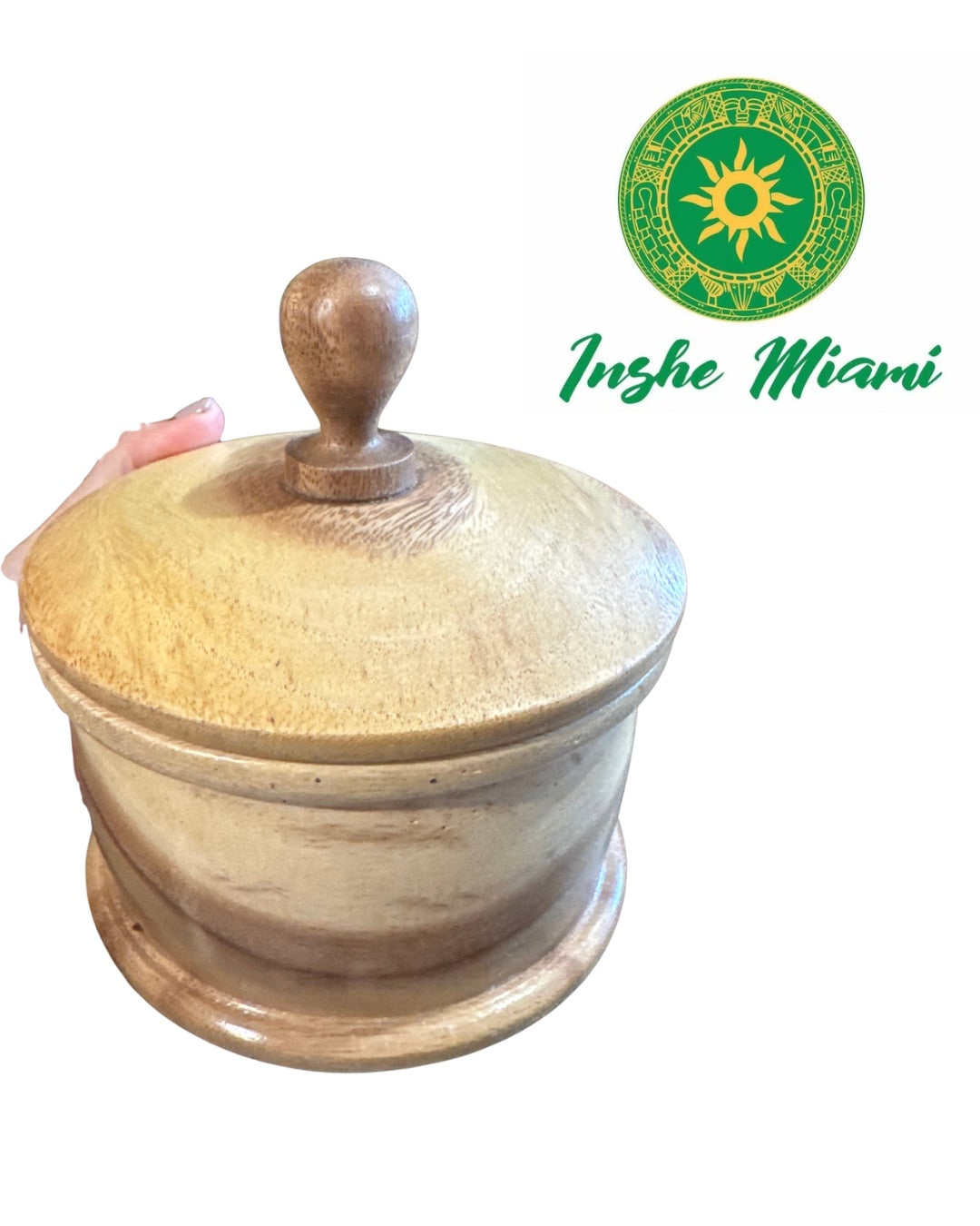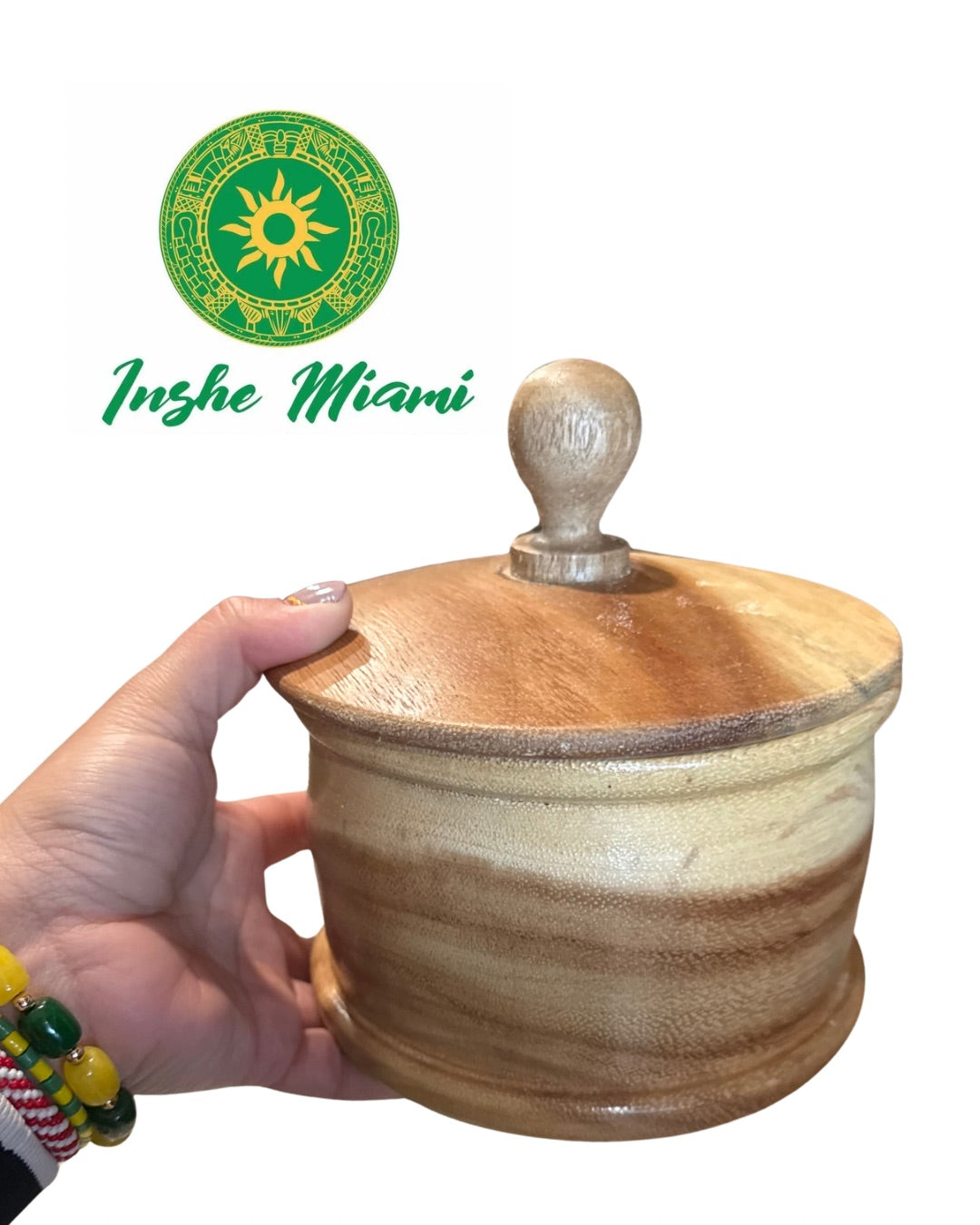 Hermosa Sopera de orula,de Ibeyis,y más de madera varnisado de aproximadamente 5 pulgadas de altura y 6 de ancho.Es espaciosa, le pueden poner 21 ikin dentro,como prueba, y queda mas de la mitad del espacio libre.