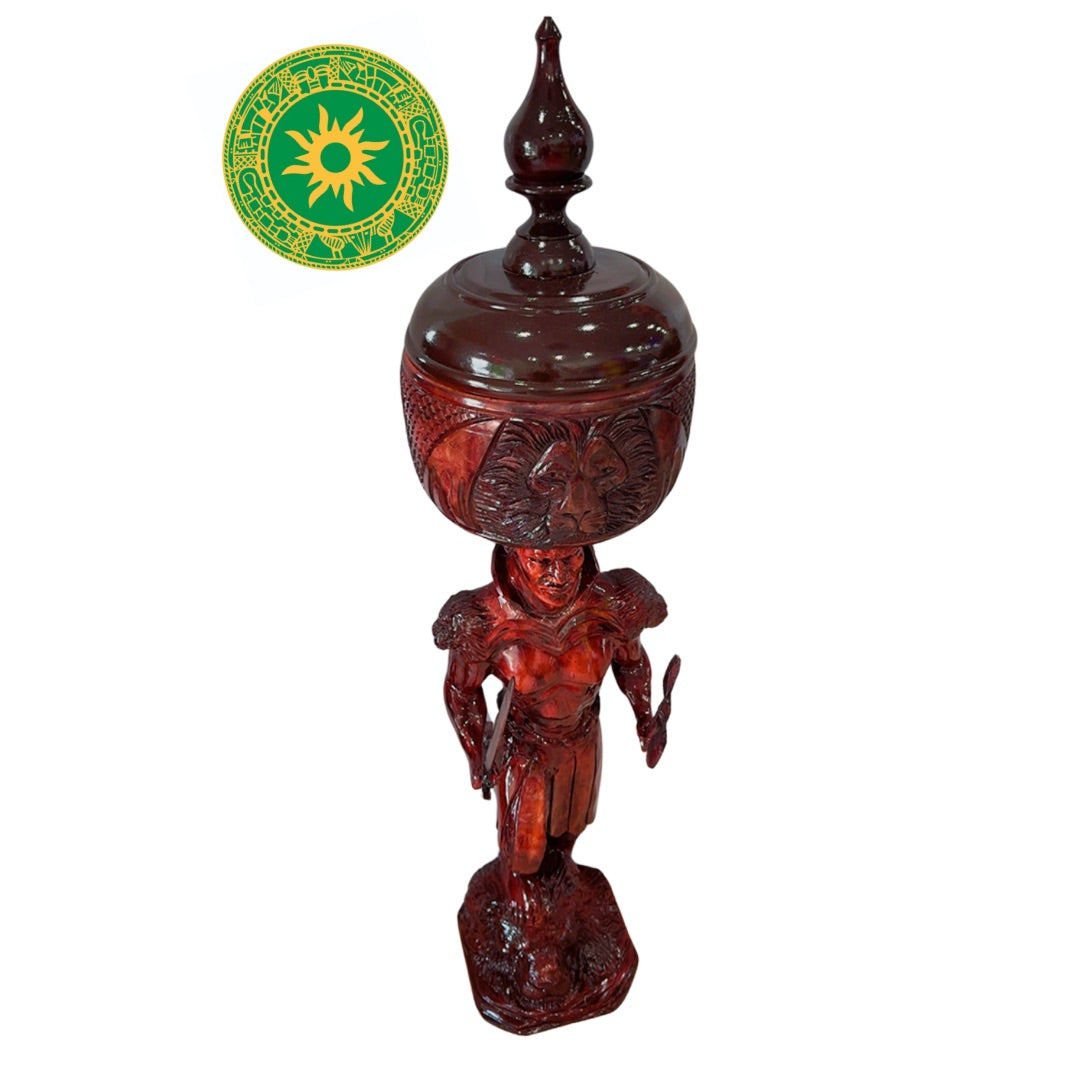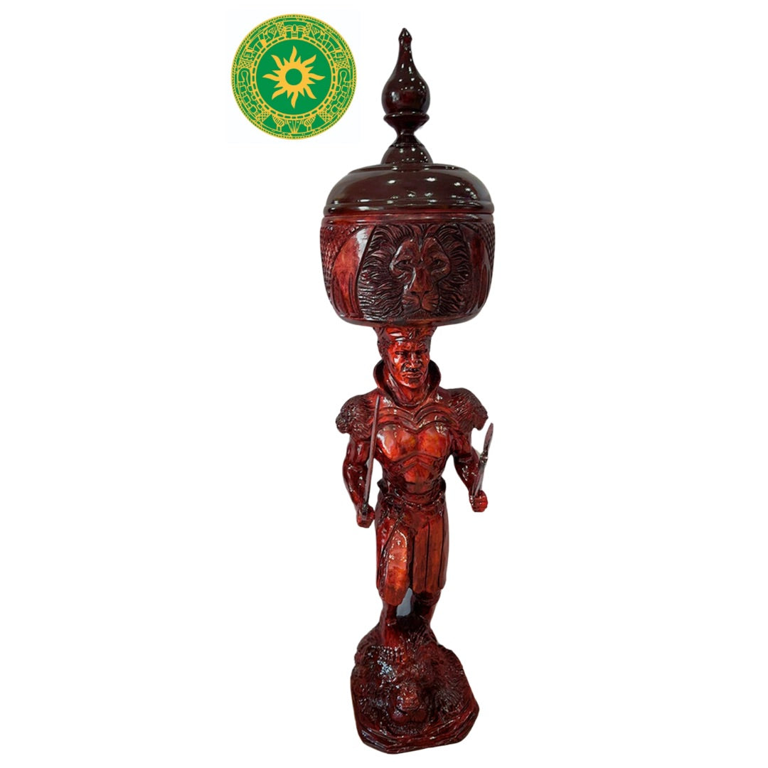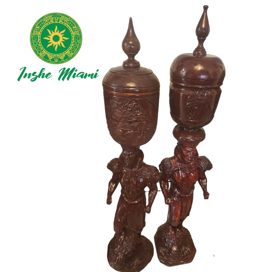 Set para Chango super especial, exclusivo, unico, por eso entran cada vez parecidos, pero siempre varian, como pueden ver en las fotos. Batea amplia de madera con su Pilon. Todo bellamente tallada a mano pensando en Chango. Mide aproximadamente (porque entraron 6 set muy parecidos, pero al ser una pieza hecha a mano no quedaron exactas) 56" de alto total, y 14" de ancho x 20" de alto en una batea. Este hermoso se es enviado en dos cajas, por su proteccion y seguridad.