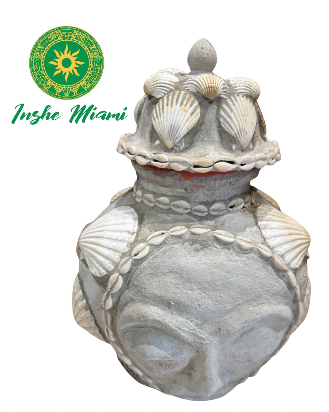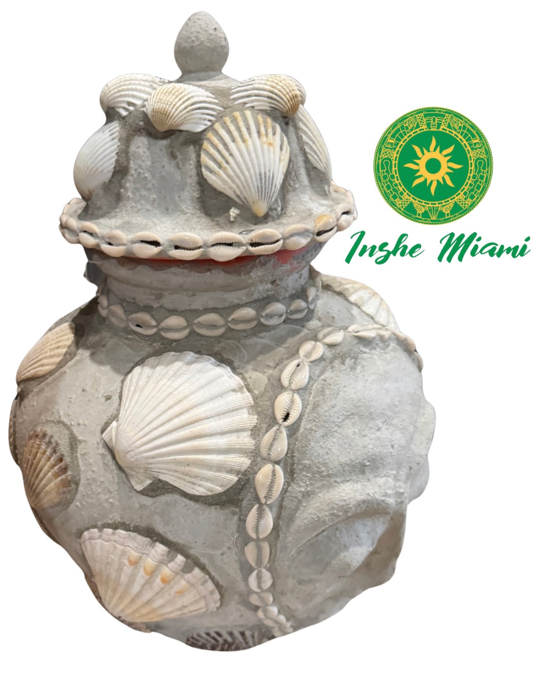 Conocida como Tinaja de Olokun de Ifa, es una preciosa pieza compuesta por barro en su fabricacion original, recubierta con una mezcla de cemento, vidrio molido, arena de mar, conchas, cowrie y calcio (egun). Esta composicion es hecha por un artista babalawo el cual conoce de estos conocimientos. Aproximadamente 22 pulgadas de alto, 13 pulgadas de ancho y de apertura en la boca es aproximadamente 5 pulgadas.