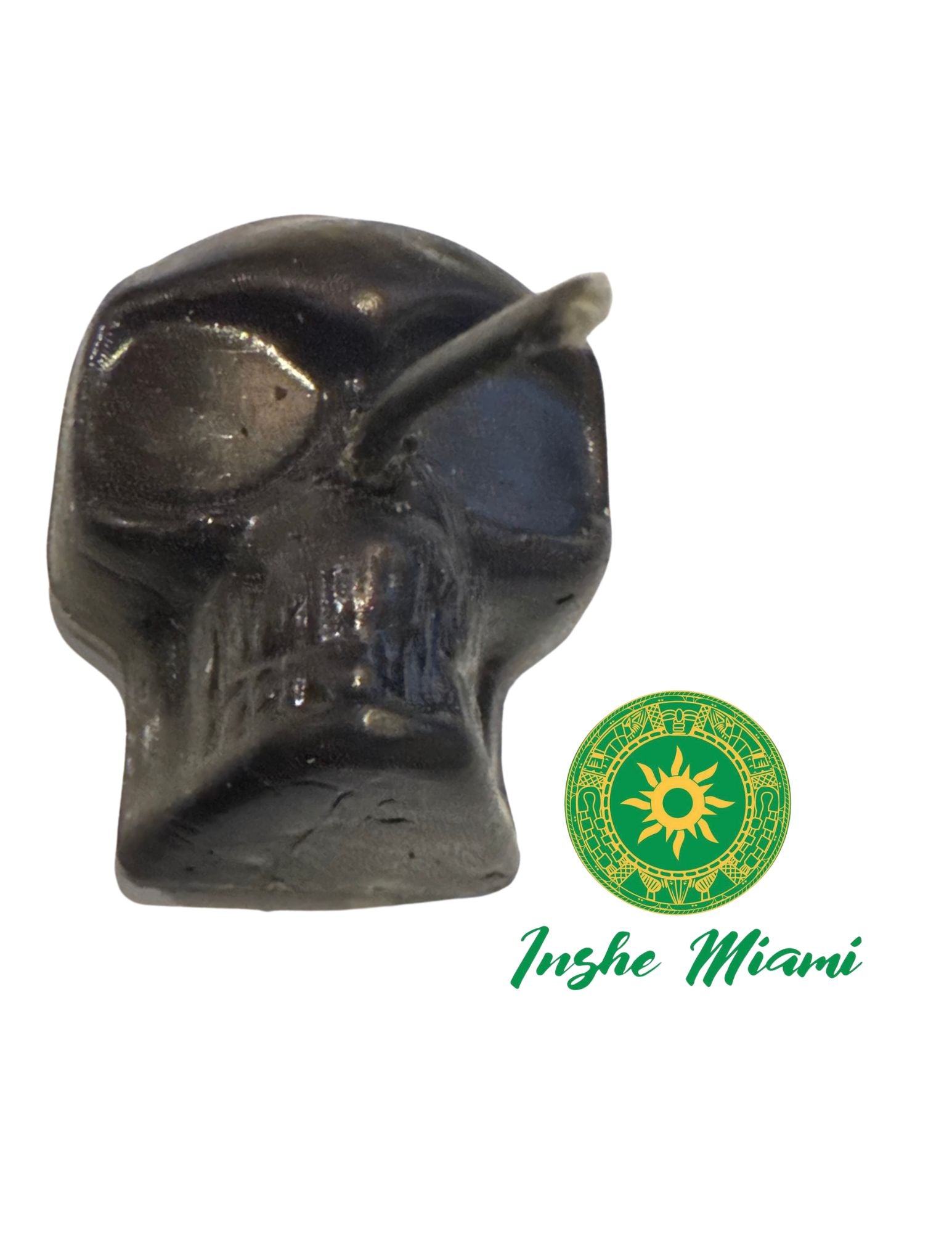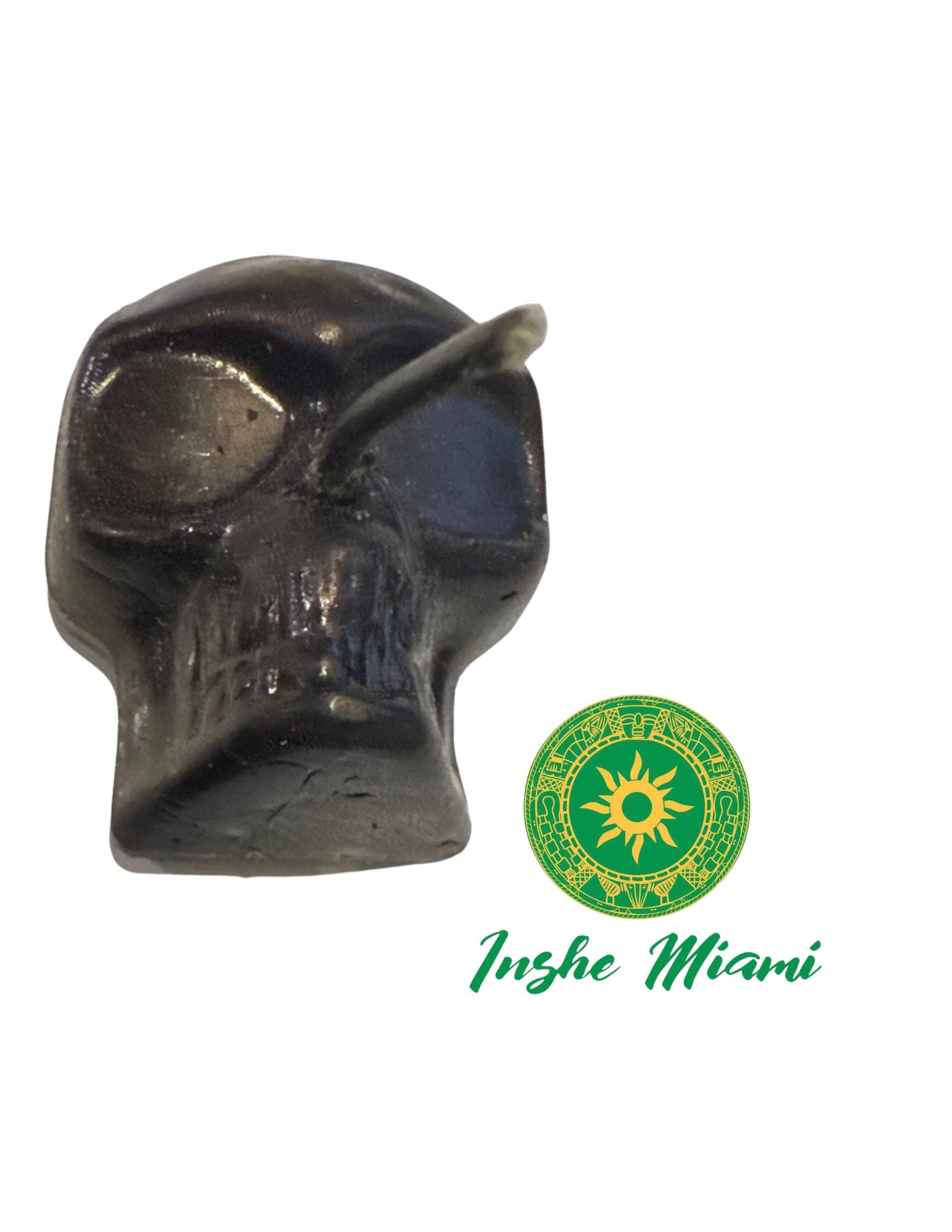 Cada vela está cuidadosamente moldeada con detalle, representando la cabeza o calavera en color negro intenso, símbolo de transformación y poder espiritual.